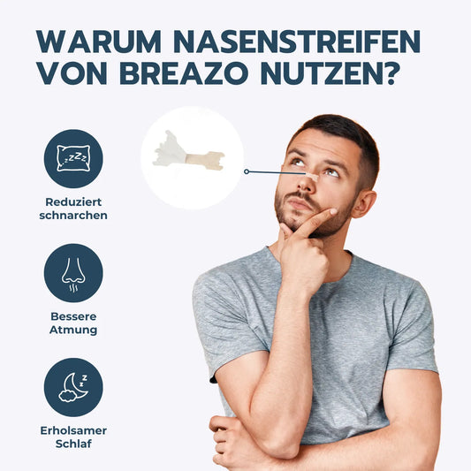 BREAZO® Nasen- und Mundstreifen sind eine wegweisende Innovation, die nicht nur die Nasenatmung unterstützt, sondern auch aktiv dazu beiträgt, Schnarchen zu verhindern.
